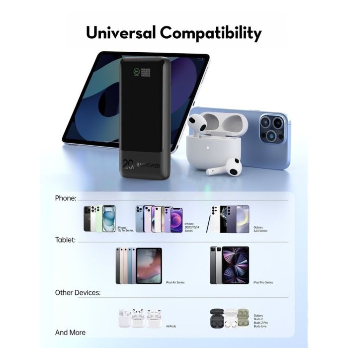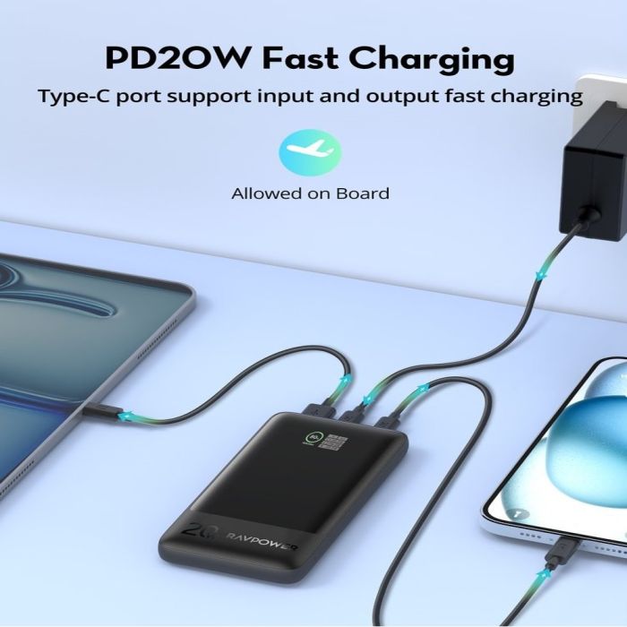 تعتبر بطارية RavPower بسعة 10000 مل أمبير وقوة 20 واط الخيار المثالي للمسافرين، بفضل تصميمها المعتمد للحمل أمبير على متن الطائرات. تضم البطارية منفذين USB-C ومنفذ USB-A مع مؤشر ديجتال دقيق للنسبة المتبقية. تدعم تقنية PD 3.0 لشحن 3 أجهزة معاً بسرعة وأمان، مما يضمن لك بقاء أجهزتك جاهزة للاستخدام في أي وقت.