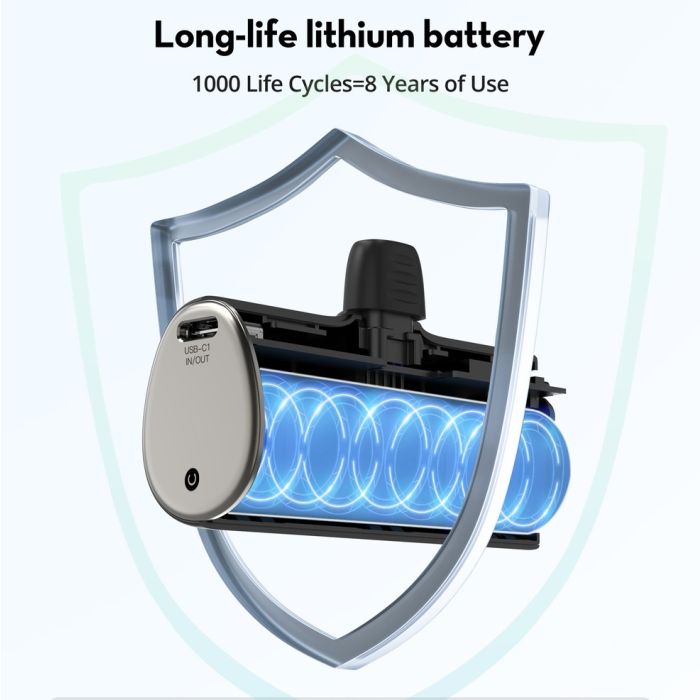 أحصل على طاقة إضافية لأجهزتك أينما ذهبت مع البطارية الاحتياطية المدمجة، تصميم خفيف الوزن يسهل حمله وملائم لوضعه في جيبك، مزود بمقبس شحن مدمج USB-Cمما يوفر شحناً مريحاً في متناول يدك دون الحاجة إلى كيبلات إضافية
