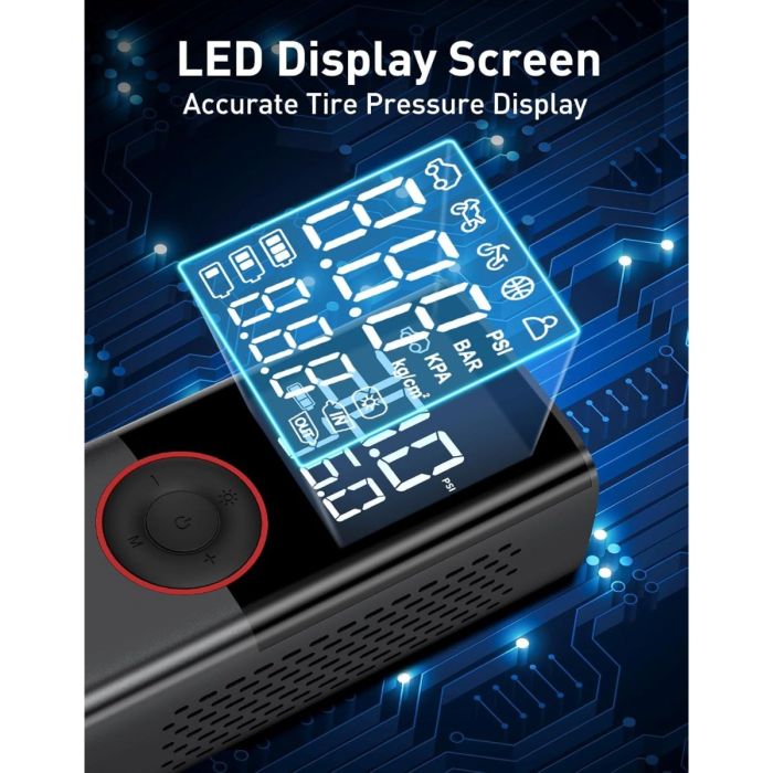 - مضخة هواء وبطارية احتياطية قابلة لإعادة الشحن مع شاشة LED