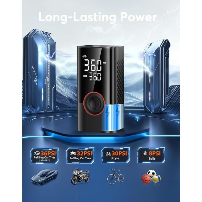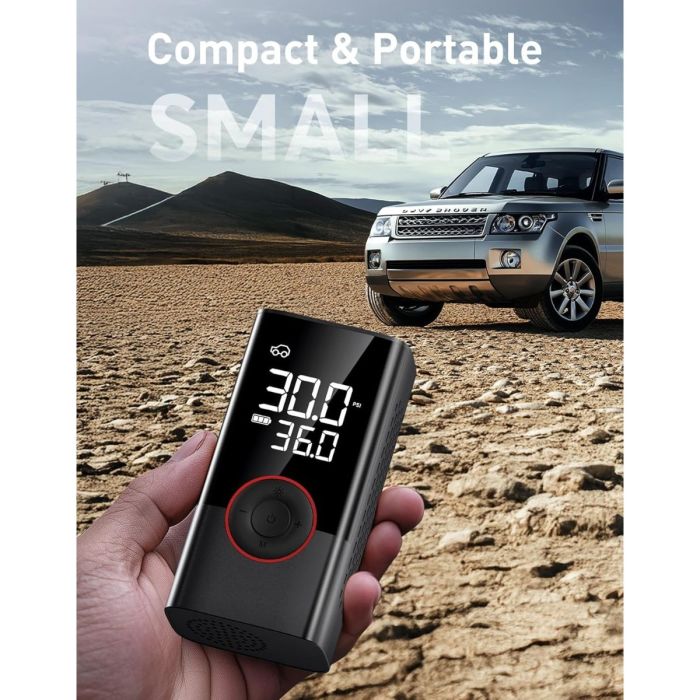 وفر وقتك على الطريق مع مضخة الهواء التى تنفخ الإطار من 30 إلى 36 رطل لكل بوصة خلال 40 ثانية فقط. يتميز بخاصية الإيقاف التلقائي عند الوصول إلى الضغط المحدد لضمان الاستخدام الآمن. بفضل بطاريته القابلة للشحن، فهو جاهز دائمًا لسيارتك، دراجتك أو دراجتك النارية. يحتوي على 5 أوضاع مسبقة تشمل السيارات، الدراجات النارية، الدراجات الهوائية، والكرات الرياضية، بالإضافة إلى وضع يدوي للتخصيص.
