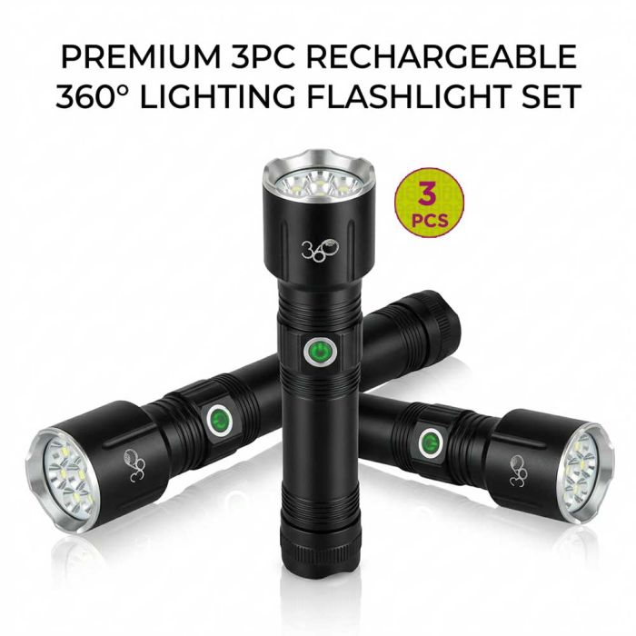 - طقم 3 مصابيح يدوية قابلة للشحن بإضاءة 360 درجة