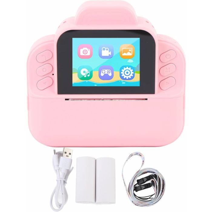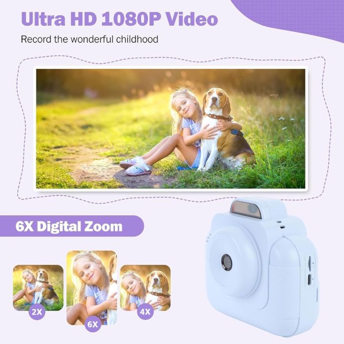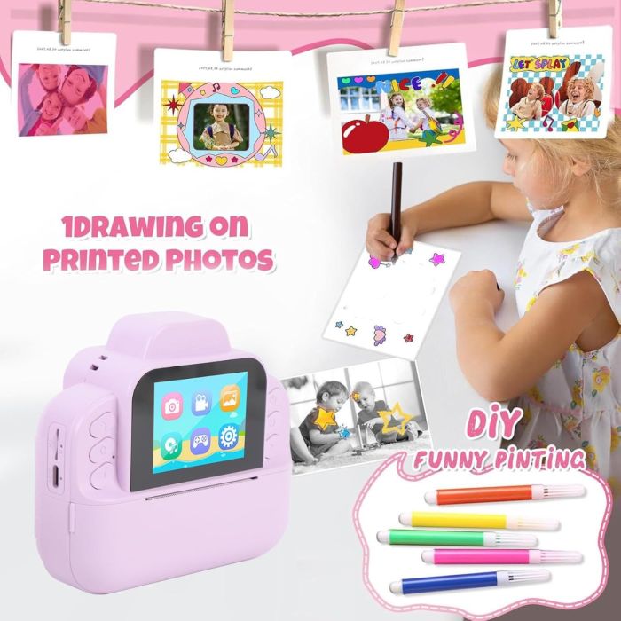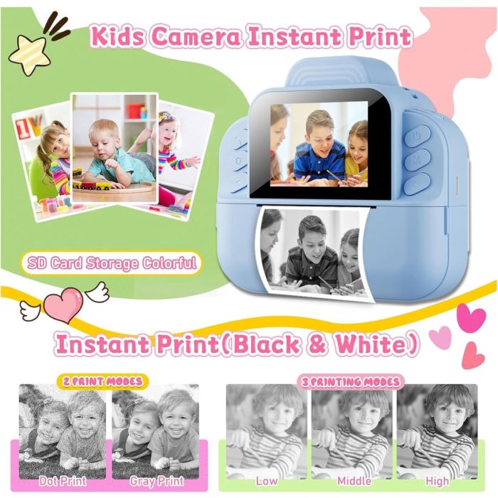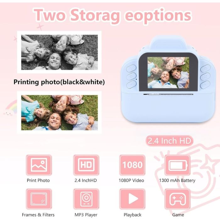 تأتي الكاميرا مزودة بشاشة ملونة عالية الدقة 2.4 بوصة، تدعم تصوير حتى 48 ميجابكسل وفيديو بدقة 1080 بكسل. بفضل الطباعة الفورية بتقنية الطباعة الحرارية يمكن للأطفال طباعة صورهم فورًا بالأبيض والأسود، ثم تزيينها بإطارات وفلاتر مرحة
