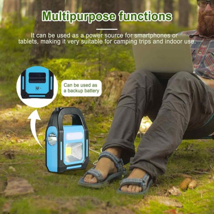 - مناسب للاستخدام الداخلي والخارجي بما في ذلك التخييم والطوارئ وأعمال الصيانة. لمبات LED عالية السطوع مع استهلاك منخفض للطاقة وعمر طويل. قابل لإعادة الشحن عن طريق USB أو الطاقة الشمسية لتوفير بيئة صديقة للبيئة. تدوم البطارية من 6 إلى 12 ساعة على أقصى سطوع. مقاوم للماء بدرجة IP65 لتحمّل المطر والرطوبة. مزوّد ببطارية مدمجة بسعة 2400 مللي أمبير. يمكن استخدامه أيضاً لشحن الهواتف في حالات الطوارئ. سهل الحمل والتخزين في المساحات الصغيرة.