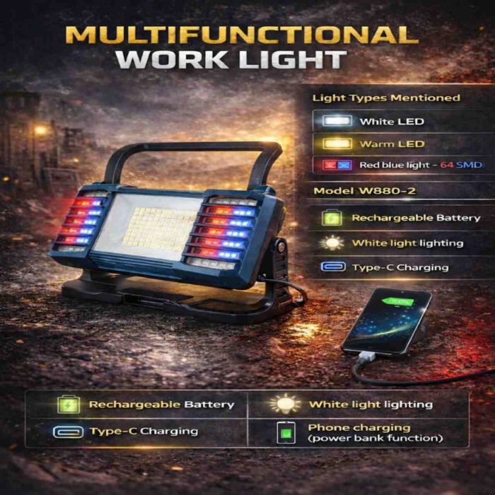 يوفر الكشاف إضاءة قوية بتقنية SMD LED مع 4 مستويات سطوع وأوضاع إضاءة قابلة للتبديل بين الدافئ والأبيض والمختلط لتناسب مختلف المهام. كما يتضمن أوضاع طوارئ متعددة باللونين الأحمر والأزرق لتكون فعالة للاستخدام على الطريق أو في حالات السلامة. تدعم البطارية المدمجة القابلة للشحن مدخل Type-C للشحن ومخرج USB لاستخدامه كباور بنك، مع شاشة مؤشر لمستوى البطارية لمتابعة الطاقة لحظة بلحظة. يتيح الحامل القابل للطي استخدامًا دون استخدام اليدين، بينما يضمن معيار IPX4 أداءً موثوقًا في الأجواء الخارجية. مناسب للورش والجراجات والتخييم وإصلاحات المنزل والفحص والطوارئ والسفر.