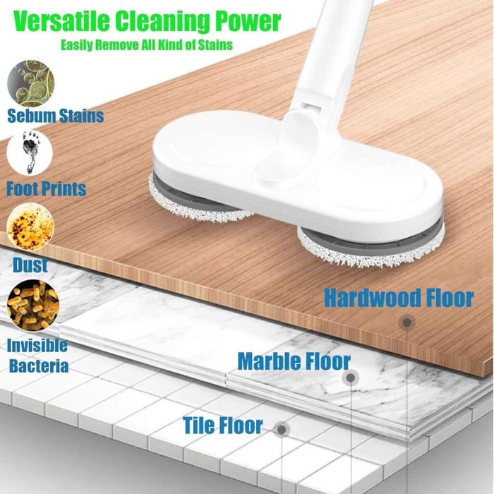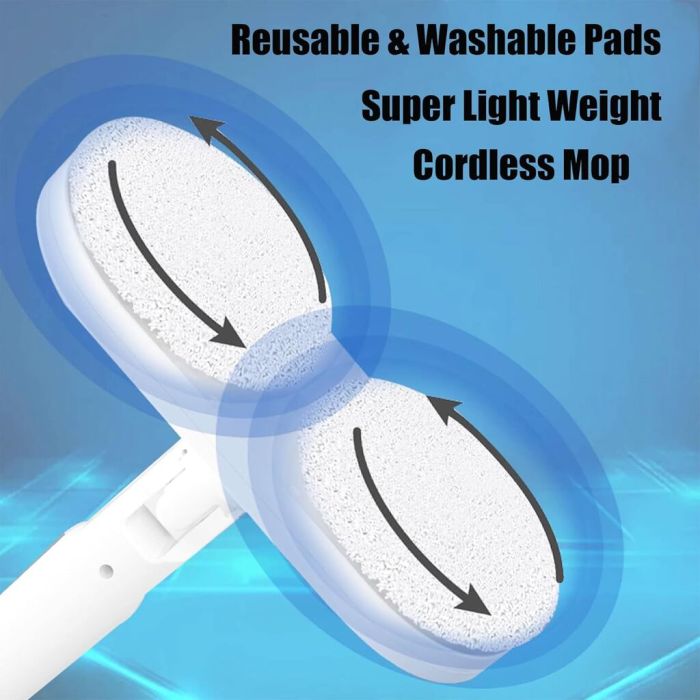 نظف أي أرضية بسهولة باستخدام ممسحة كهربائية لاسلكية. يمكن لرؤوس الممسحة المزدوجة التبديل بسهولة بين الأرضيات الصلبة والسجاد، بينما يدور المحرك القوي بقوة 30 وات بسرعة 200 دورة في الدقيقة، لإزالة الأوساخ والأتربة من البلاط والخشب وغيرها.