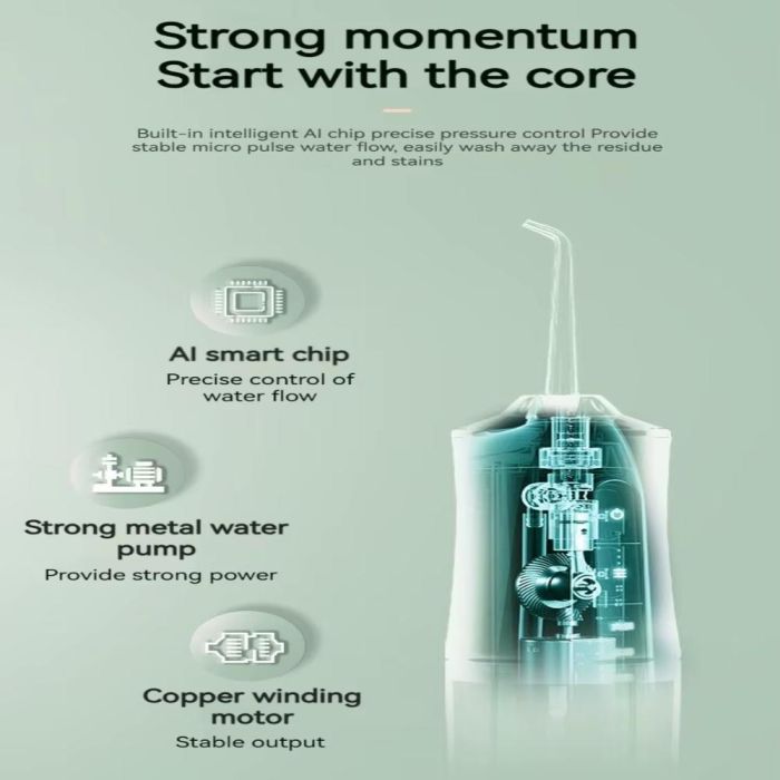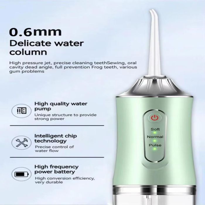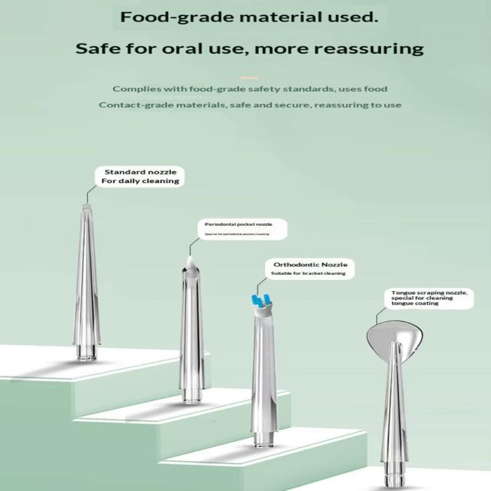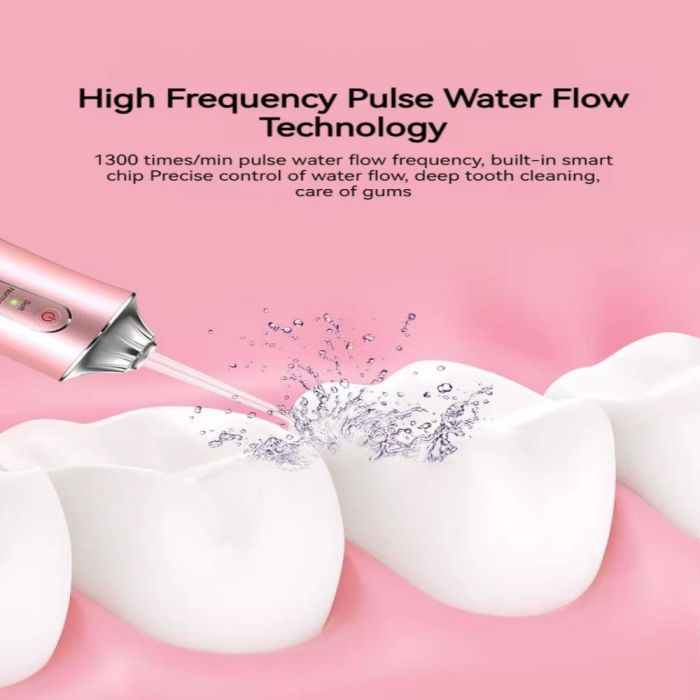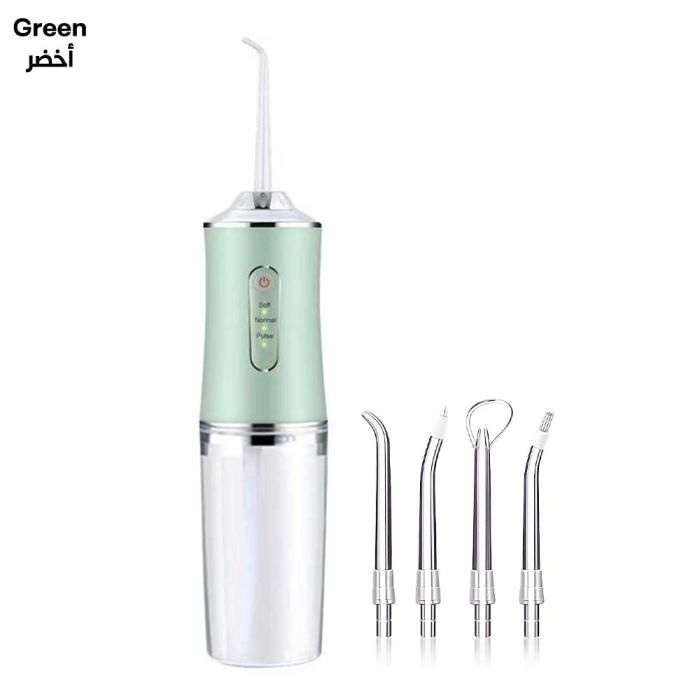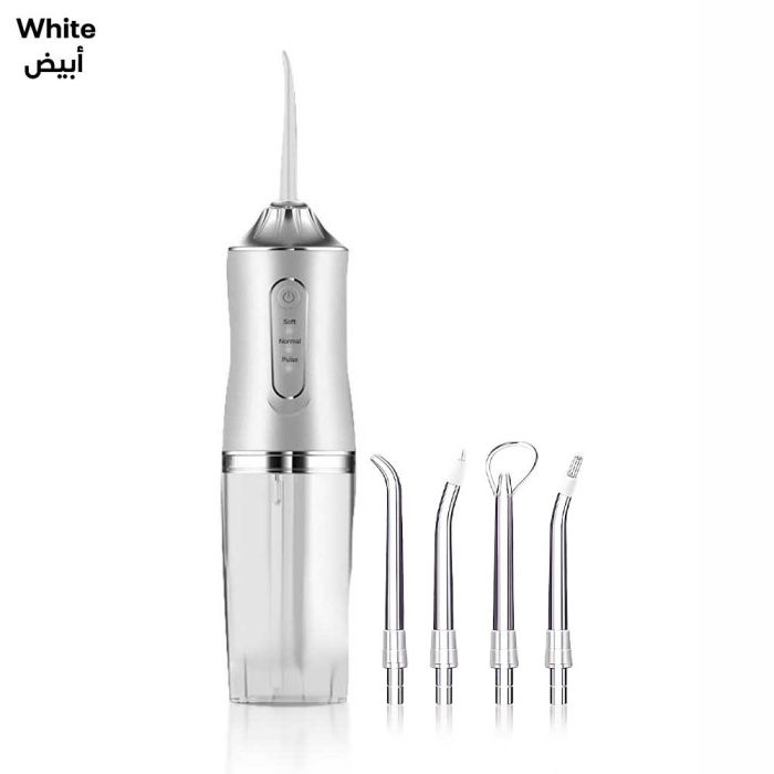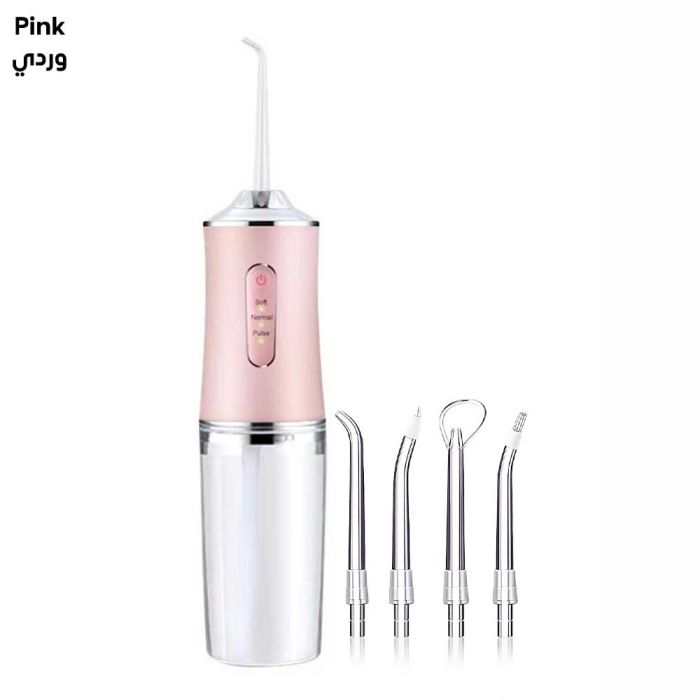 أسنان لامعة تضيء حياتك، حافظ على ابتسامة مشرقة مع جهاز تنظيف الأسنان بضغط الماء، يقوم بإزالة بقايا الطعام بين الأسنان واللثة بشكل فعال، مجهز ببطارية قابلة للشحن، خزان ماء سعة 220 مل مع 4 رؤوس قابلة للتبديل، كما أنه مثالي لمستخدمي تقويم الأسنان