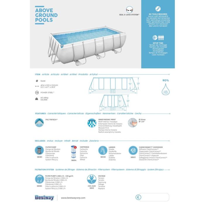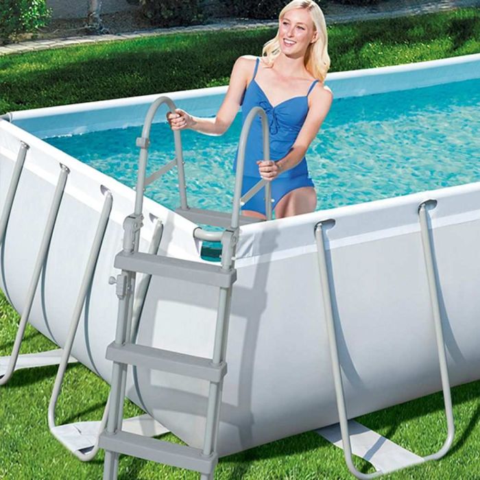 يمنحك حوض الاستحمام المستطيل مساحة رحبة لاستمتاع كل أفراد العائلة خلال فصل الصيف بفضل إطاره الفولاذي المتين المقاوم للصدأ وبطانة Tritech المقاومة للثقب مع مضخة تصفية متكاملة وسلم لضمان تجربة سباحة مريحة وآمنة وسهلة الصيانة
