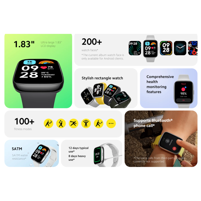 صممت هذه الساعة لتكون شريكك المثالي في كل الأوقات، فهي تدعم أنظمة أندرويد وiOS، وتأتي بتقنية البلوتوث 5.3 لضمان اتصال مستقر وسلس. سواء كنت تتابع معدل ضربات قلبك، أو تحلل نومك، أو تتمرن بأحد الأوضاع الرياضية الـ 100، فإن ساعة Redmi Watch 3 Active توفر لك كل الأدوات التي تحتاجها لتحافظ على لياقتك وصحتك