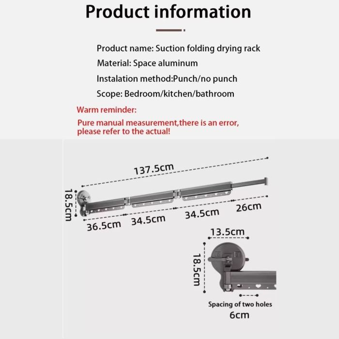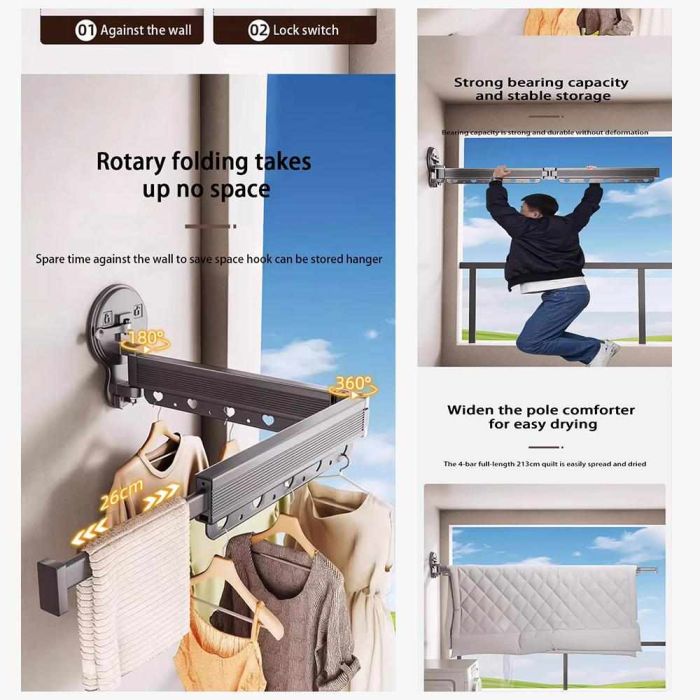 صُمم هذا الرف القابل للسحب ليوفر لك حلاً ذكيًا لتجفيف الملابس دون أن يشغل مساحة. مصنوع من الألمنيوم المقاوم للصدأ، ويتميز بسهولة تركيبه باستخدام قاعدة شفط قوية أو تثبيت تقليدي. يمكن طيه بالكامل عند عدم الاستخدام، ويدور بمرونة ليمنحك مساحة تعليق واسعة تناسب مختلف الاستخدامات.