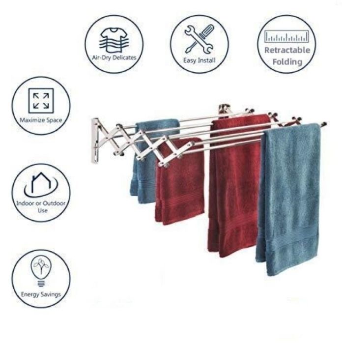 رف عملي لتجفيف الملابس يوفر مساحة واسعة ويُثبت بسهولة على الحائط. تصميمه القابل للطي وذراعه القابل للتعديل يجعله مناسبًا للاستخدام الداخلي والخارجي، مع 7 قضبان لتعليق المزيد من الملابس بسهولة.