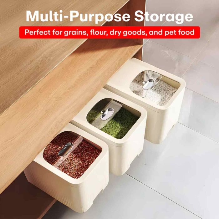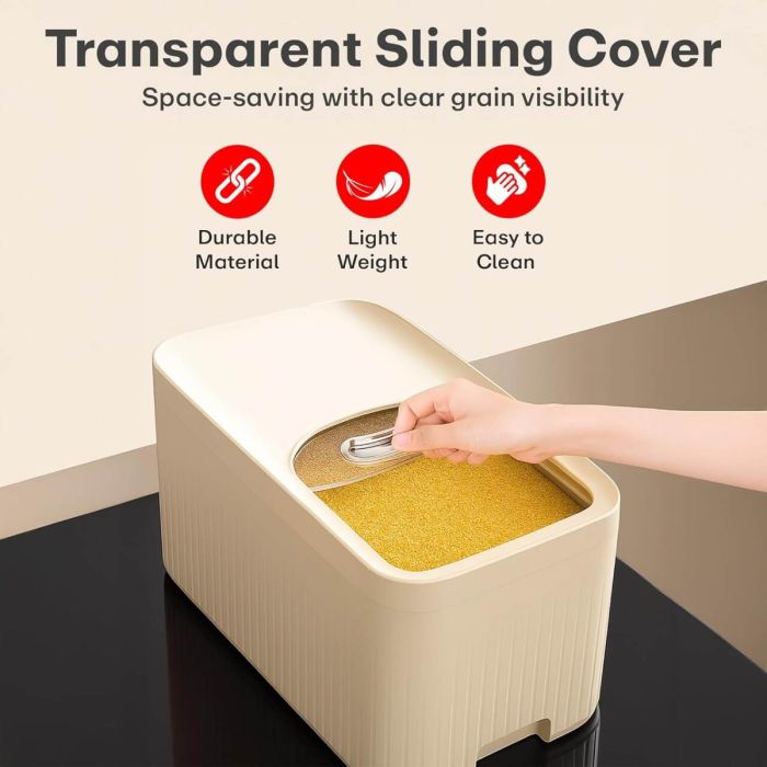 خزن الحبوب بسهولة واحتفظ بها طازجة باستخدام هذا الحاوية المحكمة الإغلاق. البلاستيك خالٍ من مادة BPA ويتميز بالمتانة لضمان تخزين آمن لمستلزمات الطعام الخاصة بك. تصميمه الأنيق والإغلاق المحكم يحميان من الرطوبة والحشرات مع الحفاظ على مطبخ مرتب. حل ذكي لتنظيم مخزنك وجعل الطهي أكثر فاعلية.