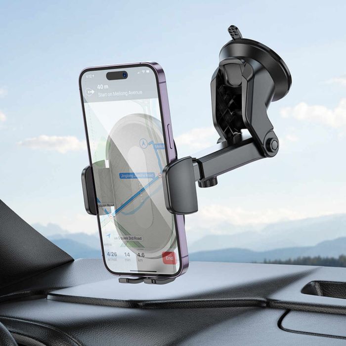 - قاعدة شفط قوية لتثبيت آمن على الزجاج الأمامي أو لوحة القيادة.
