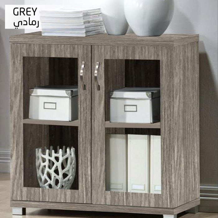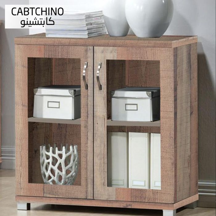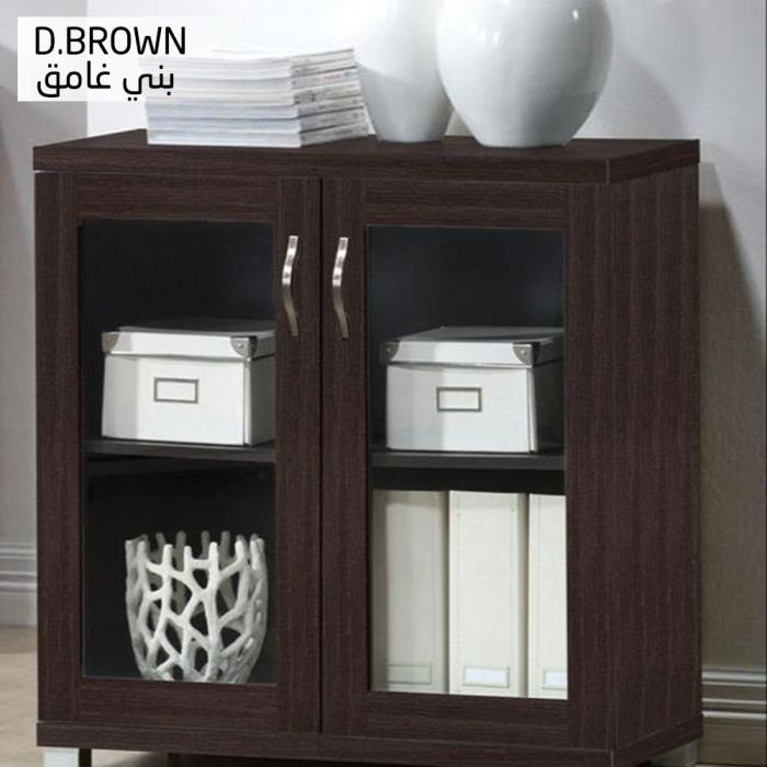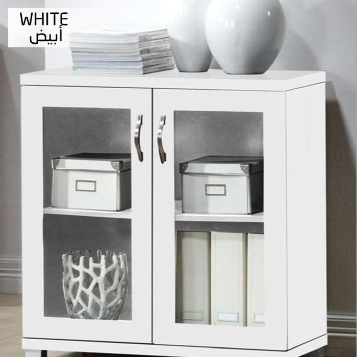طاولة عملية وعصرية لعرض الأواني، الكتب، الزينة، أو الهدايا، مع أبواب زجاجية ومساحة مناسبة لأي زاوية في المنزل.