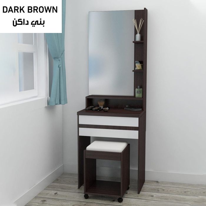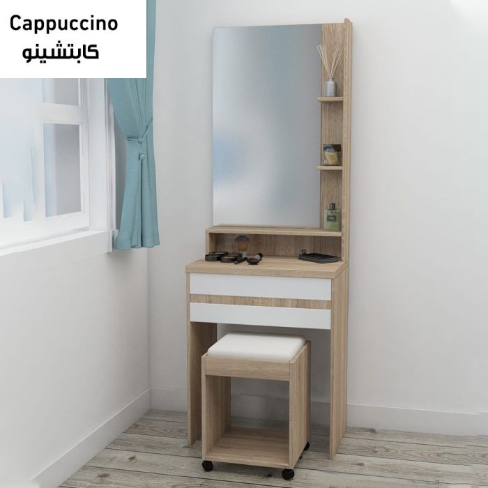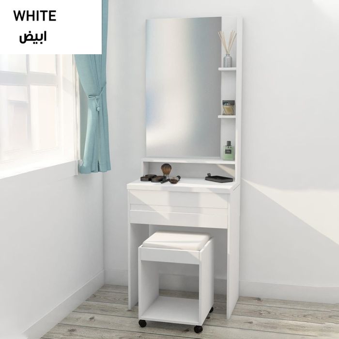 طاولة زينة عملية وعصرية مع كرسي، تجمع أدوات المكياج والتنظيم في مكان واحد مع سطح متين لعرض الديكور.