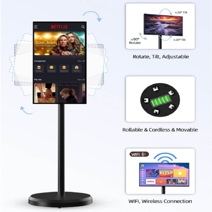 أطلق العنان للإنتاجية والترفيه أثناء التنقل، تتميز شاشة اللمس المحمولة قياس 21.5 بوصة بدقة FHD المذهلة، فهي مثالية للعروض التقديمية أو الألعاب أو توسيع مساحة العمل الخاصة بك. مع ذاكرة سعة 6 جيجابايت ومساحة تخزين 128 جيجابايت ونظام تشغيل أندرويد 12، سوف تستمتع بأداء سلس مع سهولة الوصول إلى تطبيقاتك المفضلة. مجهزة بستاند وعجلات مدمجة لتتبع خطواتك في أي مكان. سواء استخدمتها في غرفة المعيشة، غرفة النوم، المطبخ أو حتى في المكتب والمخيم. فهي مثالية حقاً للاستخدام في أماكن متعددة