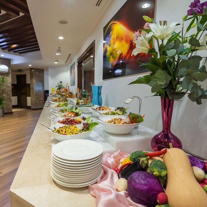 - يشمل البوفيه الطهي الحي (باستا، مأكولات خفيفة، لفائف صاج)