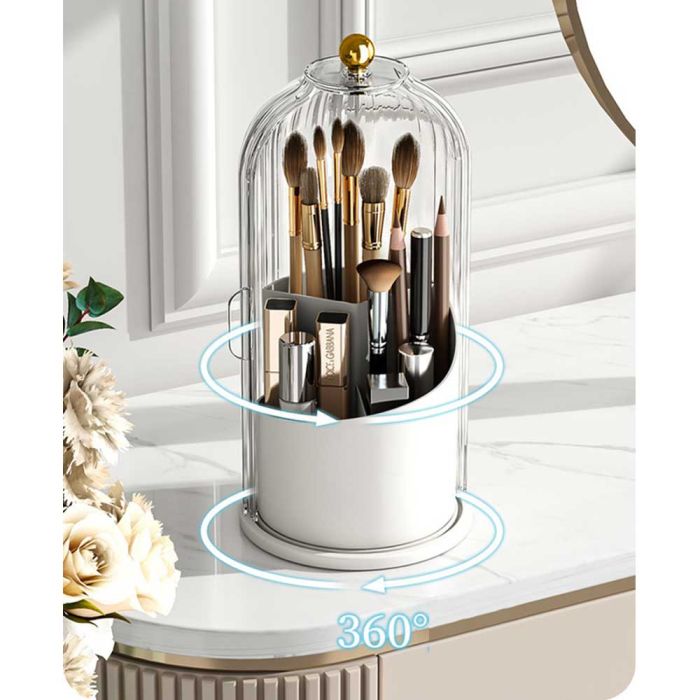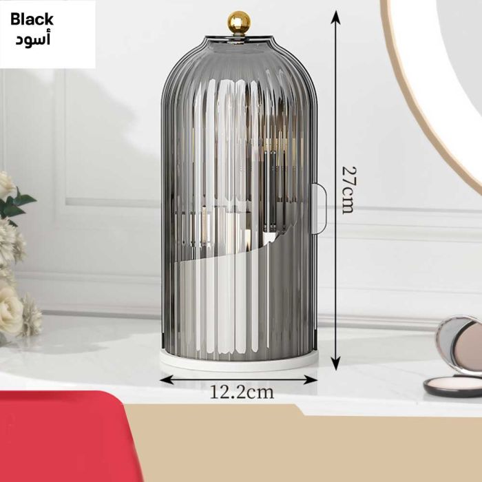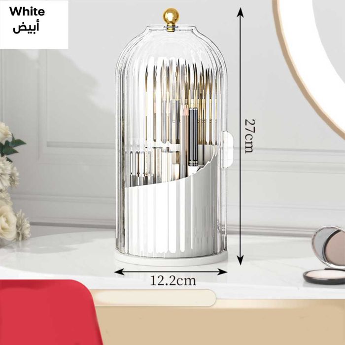 منظم فرش المكياج الدوار بغطاء شفاف يحمي أدواتك من الغبار ويجعل الوصول إليها أسرع، قاعدة دوّارة لتفاصيل مرتبة على الطاولة، تصميم أنيق يوفر مساحة ويمنح مظهراً منسّقاً، خامة متينة سهلة التنظيف، غطاء محكم يعزز النظافة ويضفي لمسة راقية على روتين التجميل.