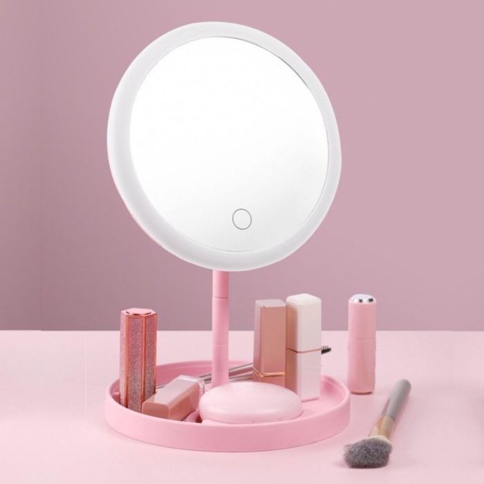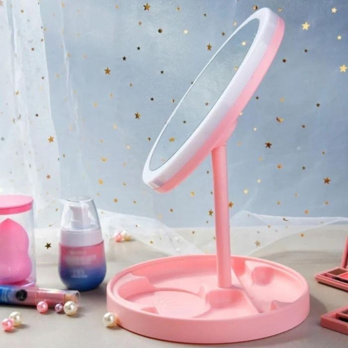 مرآه مكياج دائرية بإضاءة LED وقاعدة تخزين