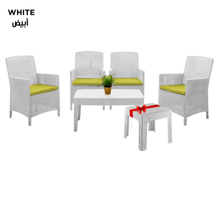 صفقة اليوم هي طقم جلسة أنيق Havana من الرتان 4 كراسي وطاولة مستطيلة مع طاولة إضافية صغيرة مجاناً قياس 40×40 سم من Samba