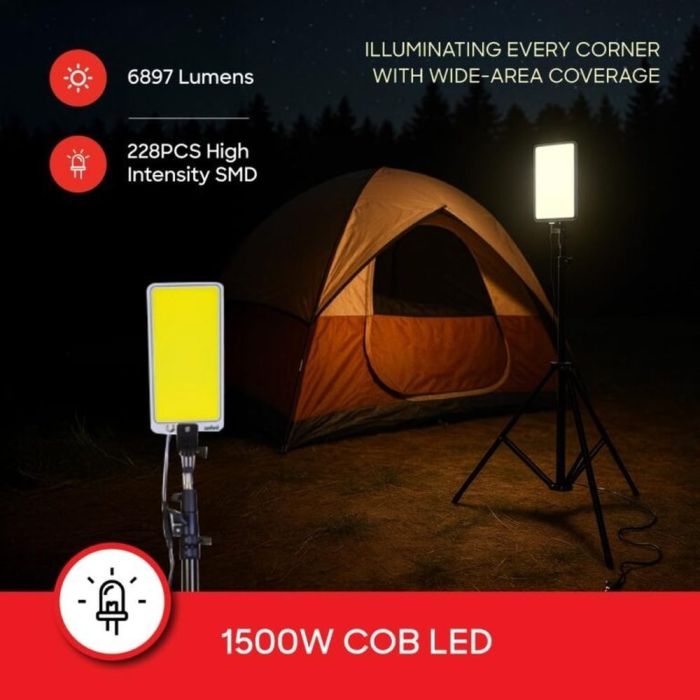 كشاف تخييم خارجي قوي 1500 واط يوفر إضاءة واسعة وقوية للمخيمات والأنشطة الليلية بفضل تقنية COB LED عالية الكفاءة. القاعدة القابلة للتمديد حتى 2.7 متر والريموت يمنحان مرونة كاملة في توجيه الضوء والتحكم به، ليكون حلاً عملياً للرحلات البرية وأعمال الصيانة والإضاءة المؤقتة.