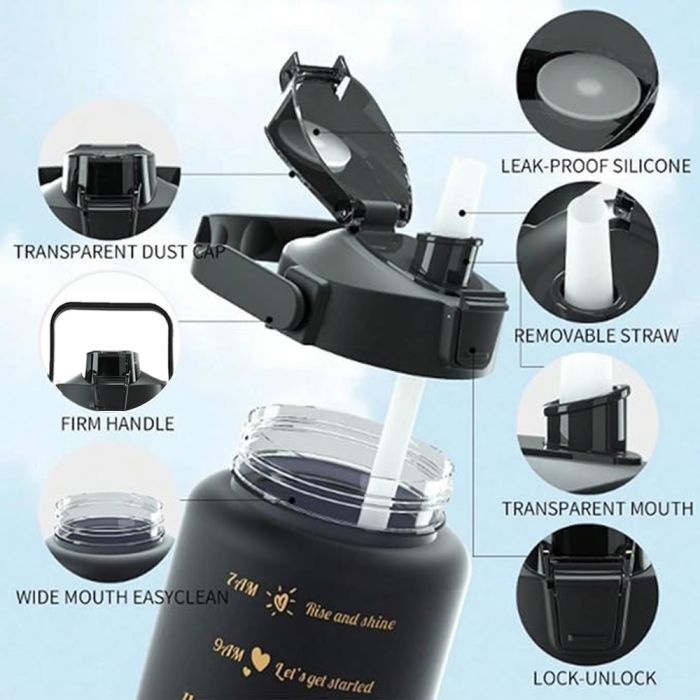 زجاجات مياه تهتم بصحتك. توفر هذه الزجاجات المميزة كلمات تحفيزية ومؤشرات زمنية للتذكير والحفاظ على الترطيب، وذلك لتناول كمية المياه التي يحتاجها جسمك طوال اليوم لتجنب الجفاف. وبفضل سطح الزجاجات الشفاف، سيكون لديك دائماً رؤية واضحة لمستوى الماء وتعبئة الزجاجة. مصنوعة من مواد عالية الجودة ومجهزة بشفاطة سيليكون ناعمة، مقياس معياري، مفتاح للفتح والغلق، وحلقة سيليكون محكمة الغلق ومانعة للتسرب، مما يجعلها مثالية للتدريبات الرياضية والجري والمشي لمسافات طويلة وركوب الدراجة وأكثر...