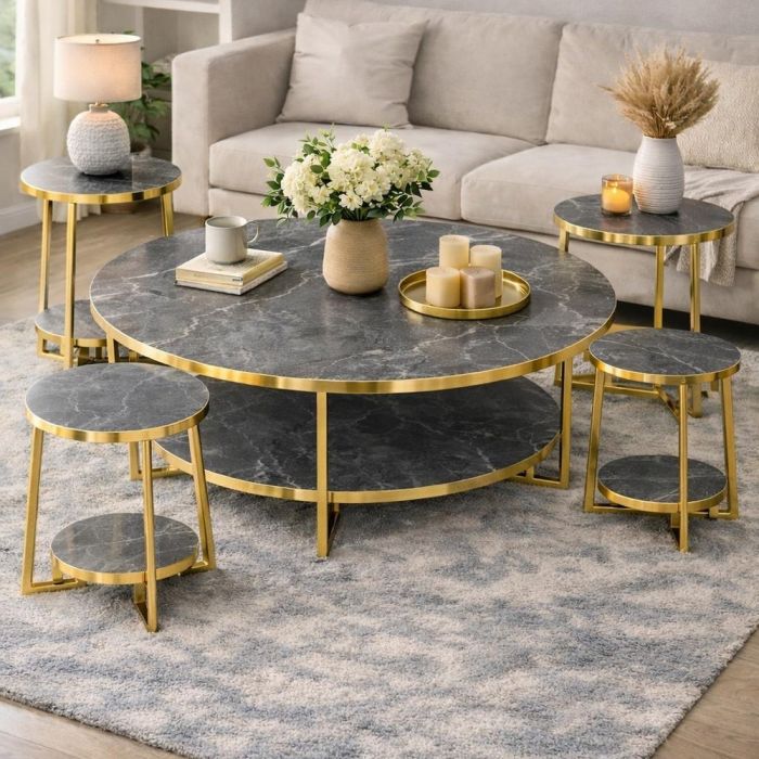 أضف لمسة من الأناقة والفخامة لغرفة المعيشة مع طقم طاولات القهوة التركي. يتضمن طاولة مركزية كبيرة وأربع طاولات جانبية صغيرة متناسقة، مصممة بإطار معدني عصري وسطح فاخر. مثالي للديكورات العصرية والفاخرة، يجمع بين الجمال والعملية في تصميم واحد.