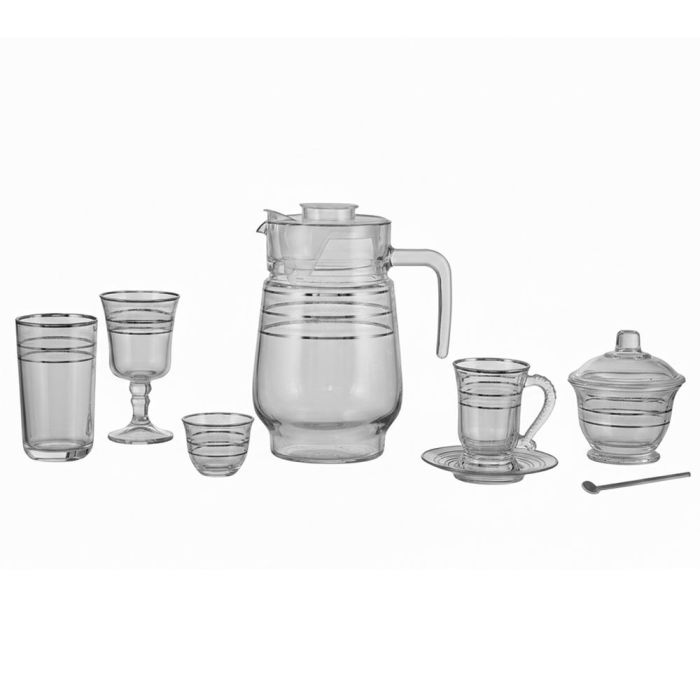 - محتوى الطقم: 12 فنجان قهوة عربية + 12 كوب شاي + 12 صحن + 12 ملعقة + 12 كوب ماء + 2 كوب سكر + 1 إبريق مع غطاء
