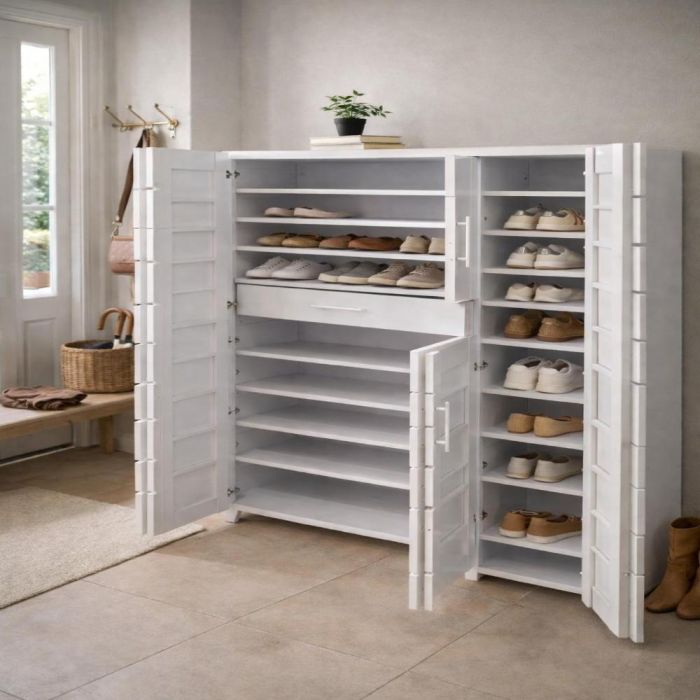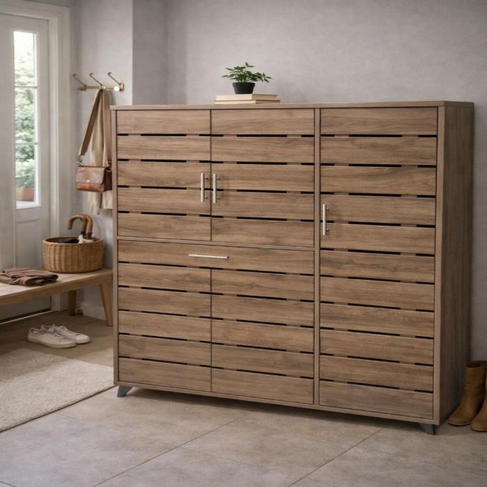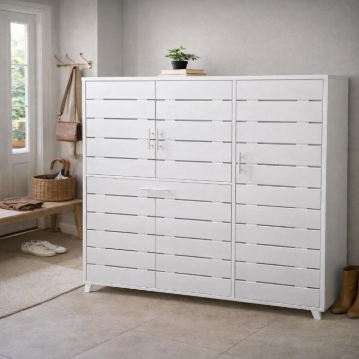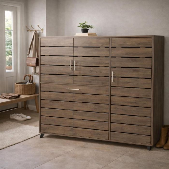 خزانة أحذية أنيقة بسعة تخزين كبيرة، مزودة بأرفف قابلة للتعديل وأبواب مهوّاة، مثالية لتنظيم المدخل والمساحات العصرية.