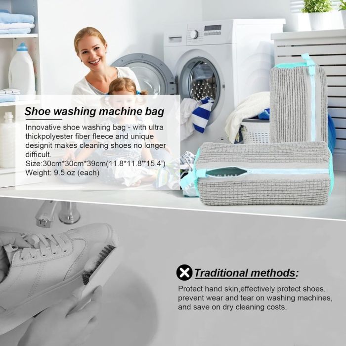 تساعد هذه الحقيبة في تنظيف الأحذية داخل الغسالة دون تلف، حيث تحافظ على شكل الحذاء وتمنع الاحتكاك، ما يجعل الغسيل أكثر أمانًا ويوفر وقت التنظيف اليدوي.