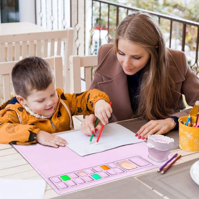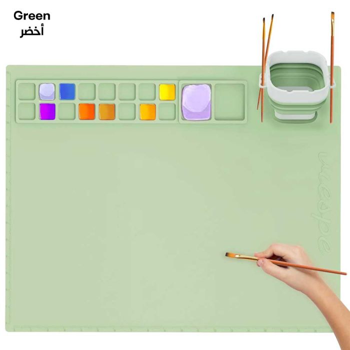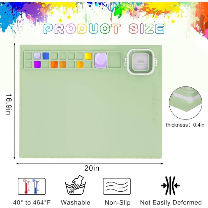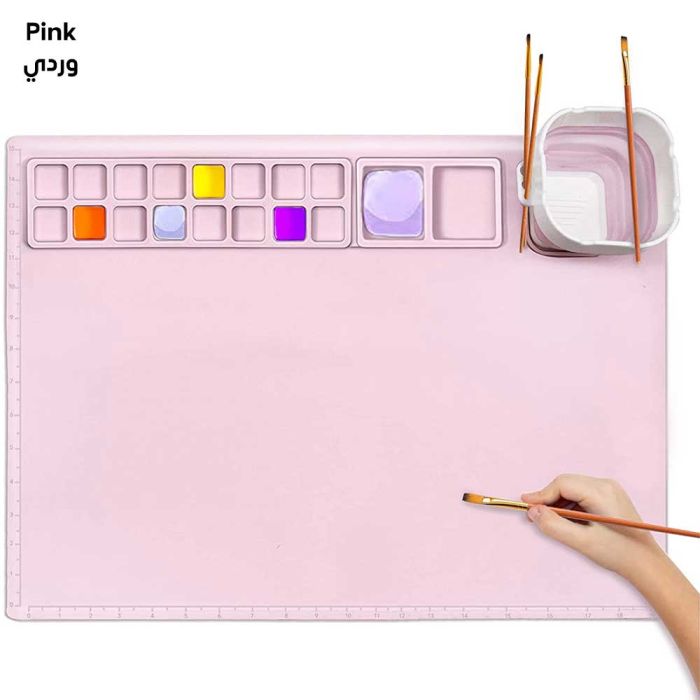 أطلق العنان للفنان بداخلك مع سجادة الرسم متعددة الاستخدامات . قياس 40 × 50 سم، وهي مصنوعة من سيليكون عالي الجودة صالح للطعام، مما يوفر سطحًا متينًا وغير لاصق ومقاومًا للحرارة. تتميز بـ 16 فتحة ألوان وخزانين للخلط وكوب تنظيف فرشاة قابل للطي ومساطر مدمجة