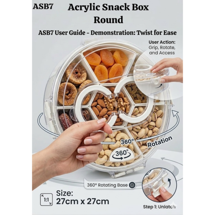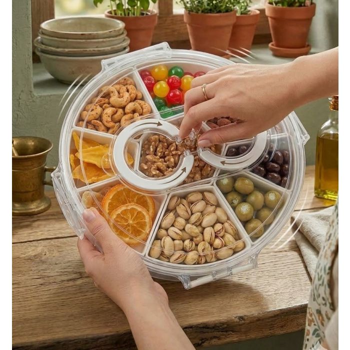 اجعل أوقات الضيافة أكثر متعة مع منظم السناكس الدوار . يتميز بتصميم دائري وقاعدة تدور بسلاسة 360 درجة، مما يتيح للجميع الوصول إلى السناكس المفضل بكل سهولة. المنظم مصنوع من بلاستيك صحي عالي الجودة خالي من مادة BPA، ويحتوي على 6 أقسام منفصلة للحفاظ على النكهات دون اختلاط.