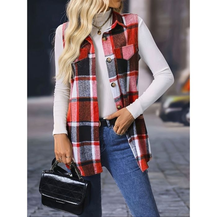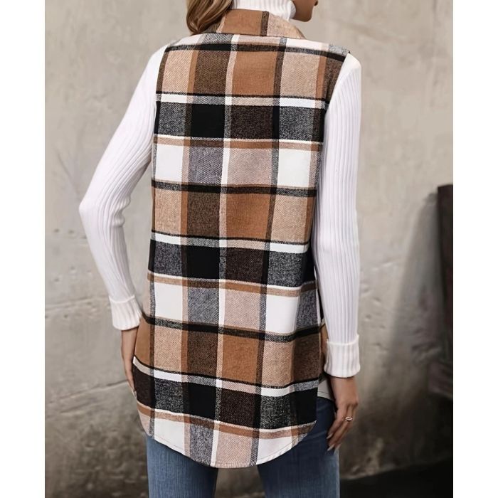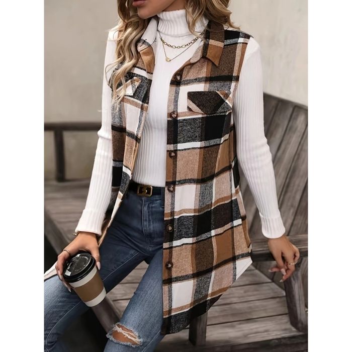 أضيفي لمسة من الأناقة العملية إلى إطلالتك مع هذا الجاكيت الكارو بدون أكمام. يتميز بنقشة كارو الكلاسيكية التي تضفي طابعاً عصرياً، وقصة مريحة تسمح بالتنسيق فوق قطع متعددة. تصميمه بدون أكمام يجعله مثالياً لأجواء الخريف المعتدلة، ويمكن ارتداؤه فوق بلوزة بأكمام طويلة أو كنزة خفيفة لإطلالة متعددة الطبقات.صفقة اليوم هي جاكيت كارو بدون أكمام للسيدات