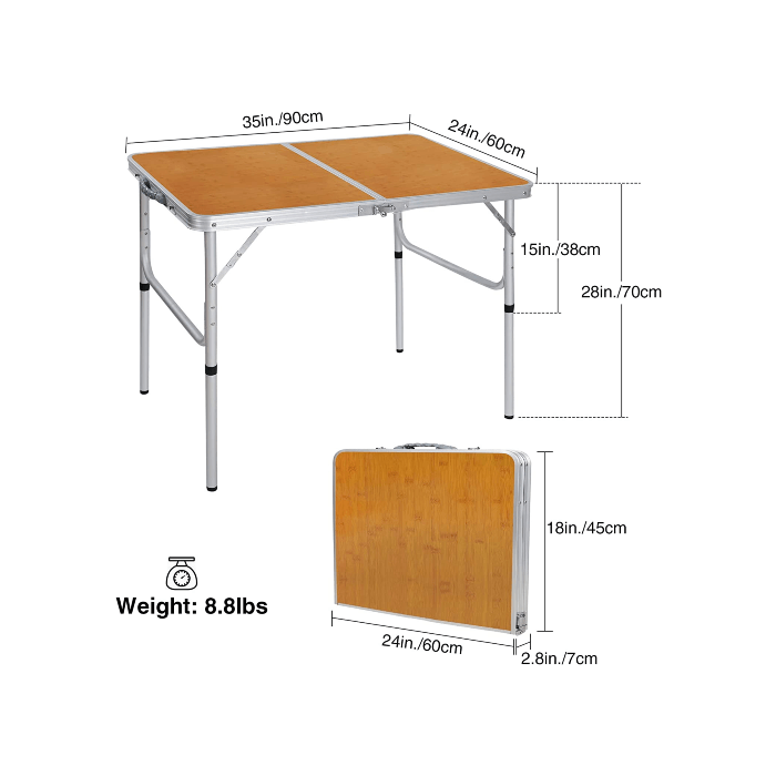 أحصل على مساحة مرنة أثناء الرحلات مع طاولة المخيم القابلة للطي، مصنوعة من خشب البامبو خفيف الوزن مع إطار متين من سبائك الألومنيوم، مقاومة للصدأ والخدش، كما أنها مقاومة للماء وسهلة التنظيف، مما يجعلها مثالية للاستخدام للعديد من الأنشطة في الهواء الطلق