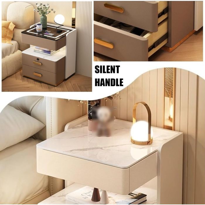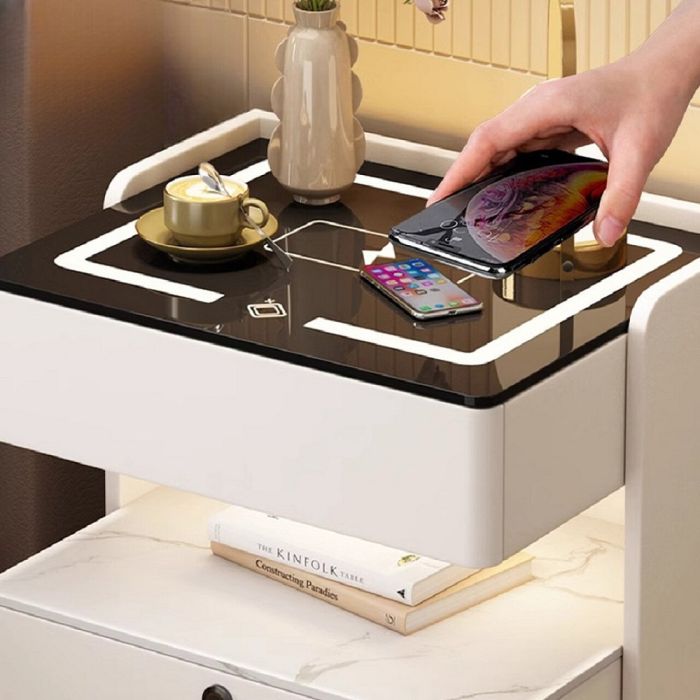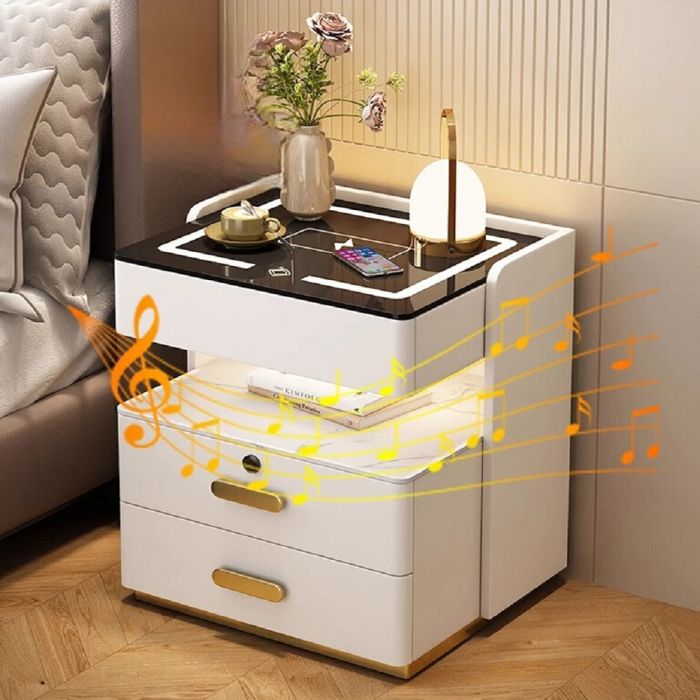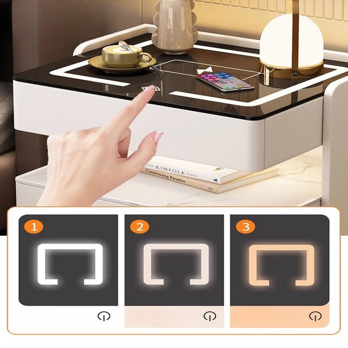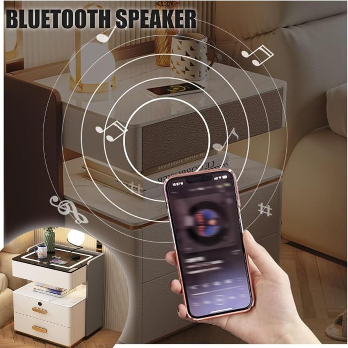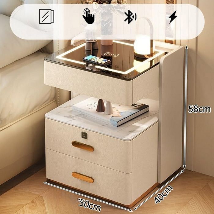 - طاولة ذكية جانبية للسرير مع شحن لاسلكي وقفل ببصمة الأصبع ومكبر صوت