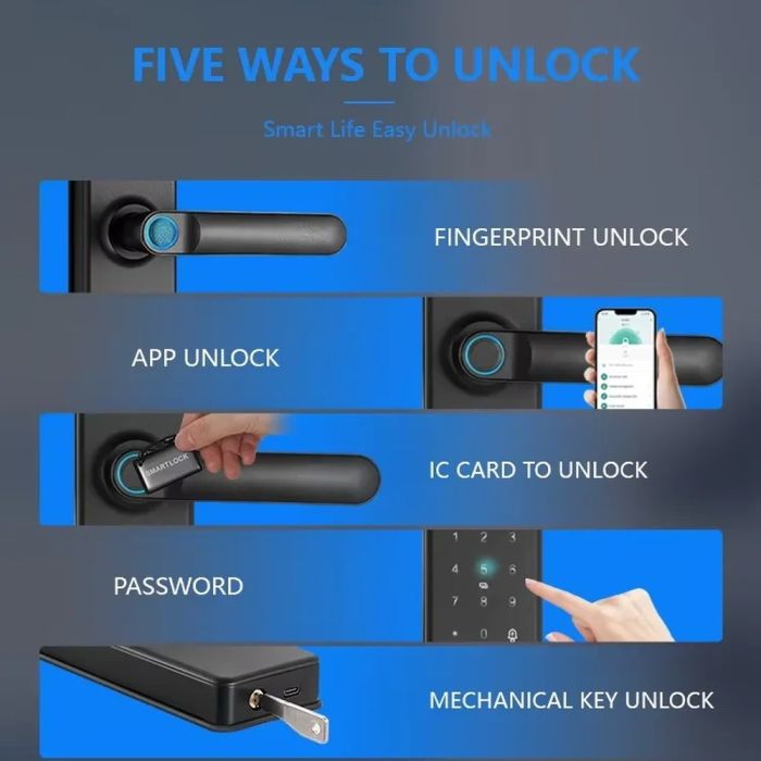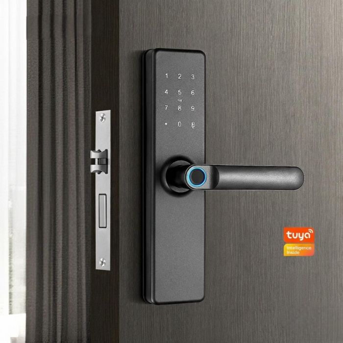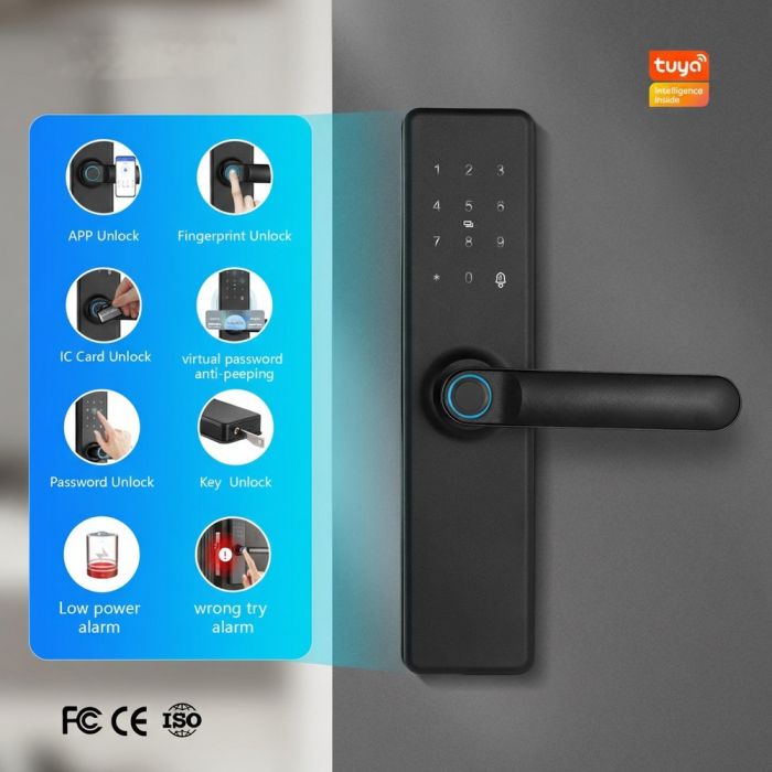 - طرق فتح متعددة تشمل البصمة، تطبيق Tuya، الرمز السري الوهمي، بطاقة IC، ومفتاح الطوارئ