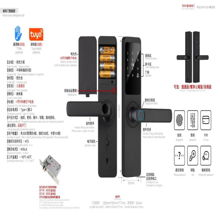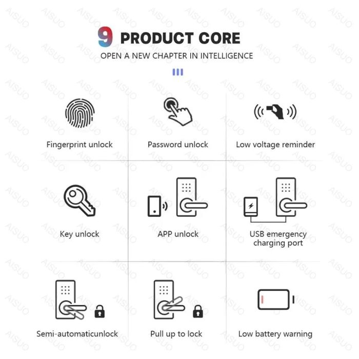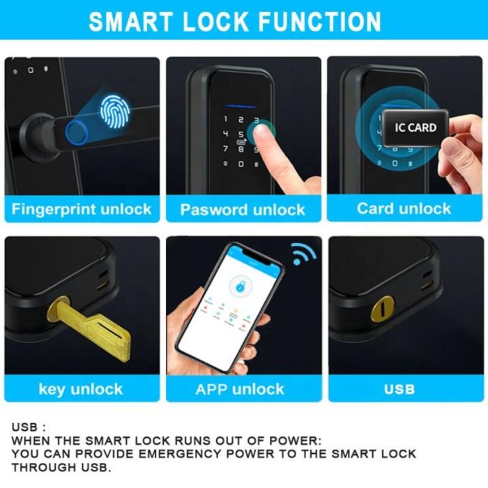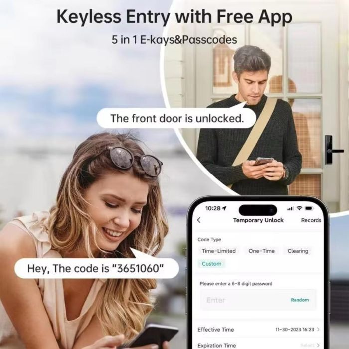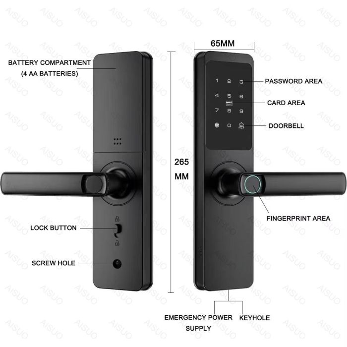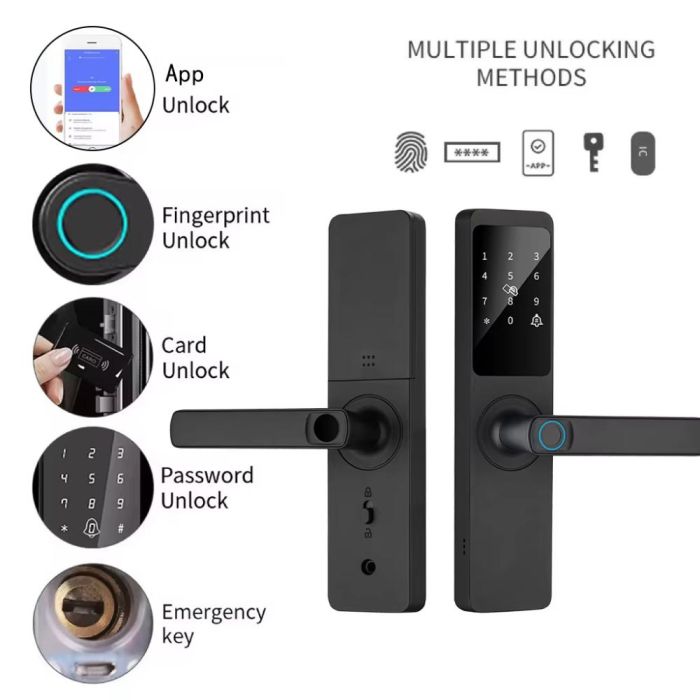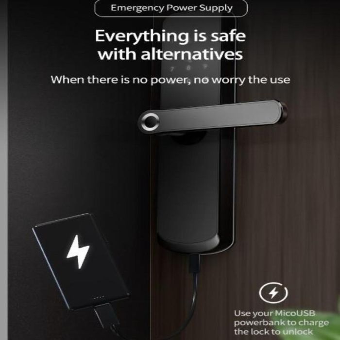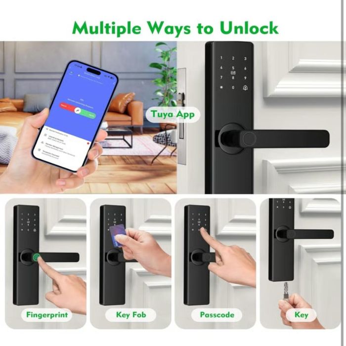 قفل ذكي مع طرق فتح متعددة يدعم البصمة وكلمة المرور والبطاقة والتطبيق، مع كلمات مرور مؤقتة ومفتاح احتياطي للأمان الكامل.