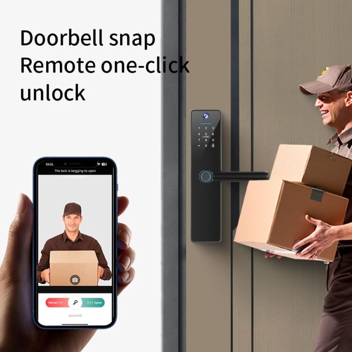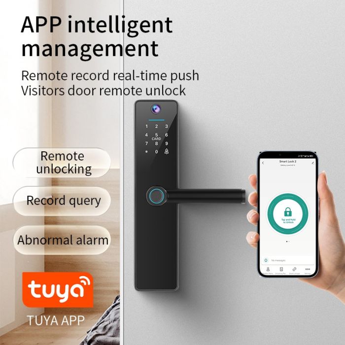 - قفل باب ذكي Wi-Fi بلوحة مفاتيح وكاميرا مدمجة وبطاقة وبصمة