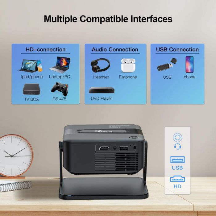 بروجكتور ذكي بدقة HD، مناسب للترفيه المنزلي وتعليم الأطفال. يقدم تجربة مشاهدة ذكية وممتعة بفضل نظام Android 11 المدمج، مما يتيح تحميل التطبيقات ومشاهدة المحتوى مباشرة دون الحاجة لأجهزة إضافية. يأتي بدقة عرض 720 بكسل مع دعم دقة 4K، وسطوع 200 ANSI لومن لعرض واضح داخل الغرف.