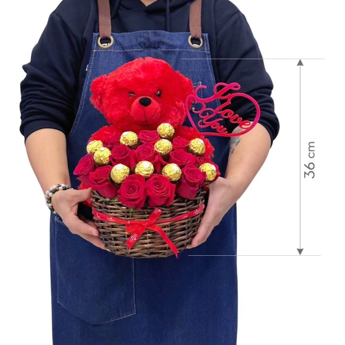 سلة فاخرة مع 13 وردة جوري + دب وشعار Love You و10 قطع شوكولا Ferrero من Sogha