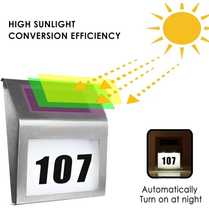 اجعل منزلك مرئياً بسهولة ليلاً ونهاراً مع هذا الكشاف LED الأنيق. مصنوع من ستانلس ستيل شديد التحمل ومصمم للاستخدام خارج المنزل، مقاوم للماء ويدوم طويلًا. حيث تقوم اللوحة الشمسية المدمجة بالشحن خلال النهار، وتضيء رقم منزلك تلقائياً بمصابيح LED ساطعة عند الغروب حتى 6 ساعات. قم بتزيين مظهر منزلك وتأكد من سهولة التعرف عليه من الزوار مع هذا الحل العملي والعصري للإضاءة