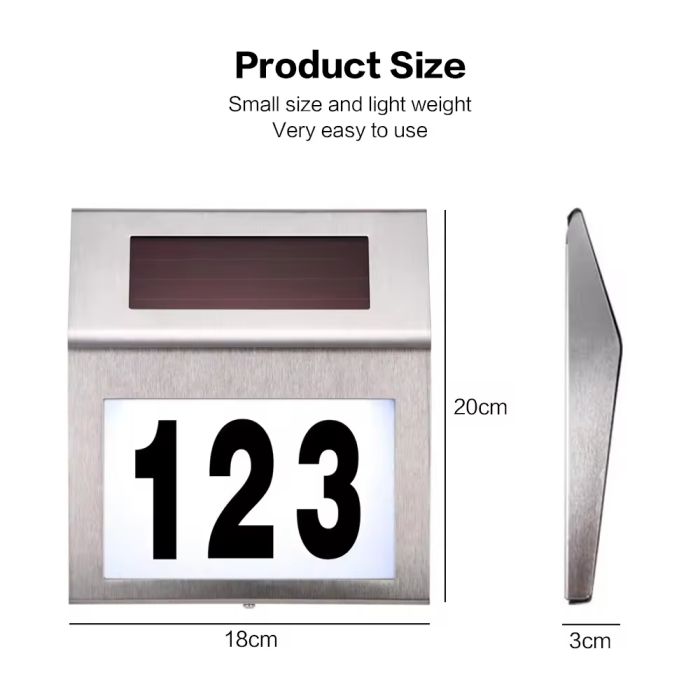 اجعل منزلك مرئياً بسهولة ليلاً ونهاراً مع هذا الكشاف LED الأنيق. مصنوع من ستانلس ستيل شديد التحمل ومصمم للاستخدام خارج المنزل، مقاوم للماء ويدوم طويلًا. حيث تقوم اللوحة الشمسية المدمجة بالشحن خلال النهار، وتضيء رقم منزلك تلقائياً بمصابيح LED ساطعة عند الغروب حتى 8 ساعات. قم بتزيين مظهر منزلك وتأكد من سهولة التعرف عليه من الزوار مع هذا الحل العملي والعصري للإضاءة
