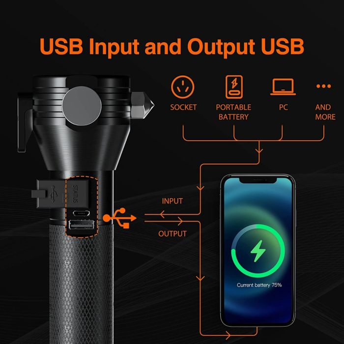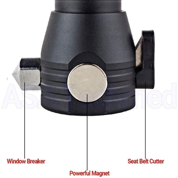 ان المصباح مجهز بمطرقة وقاطع حزام الأمان والبوصلة