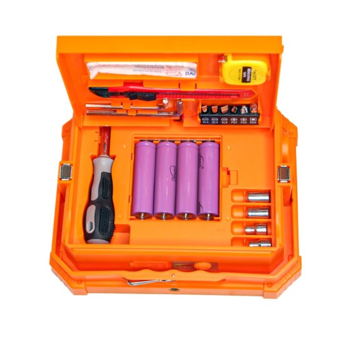- تشمل الأدوات 16 قطعة كماشة، قاطع، متر قياس، مفتاحين LN، ومفك متعدد الرؤوس