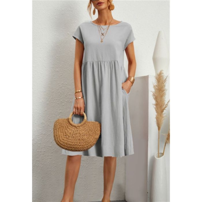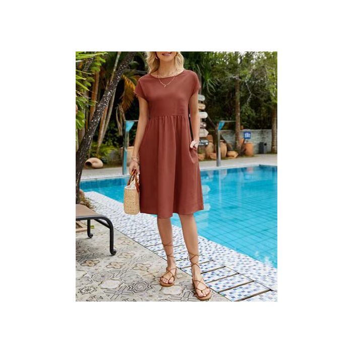 - فستان قصير بلا أكمام بقصة واسعة وجيوب من القطن والكتان بلون سادة