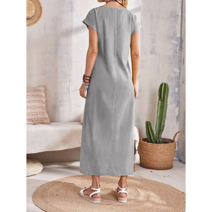 فستان سادة طويل بياقة دائرية وأكمام قصيرة للسيدات