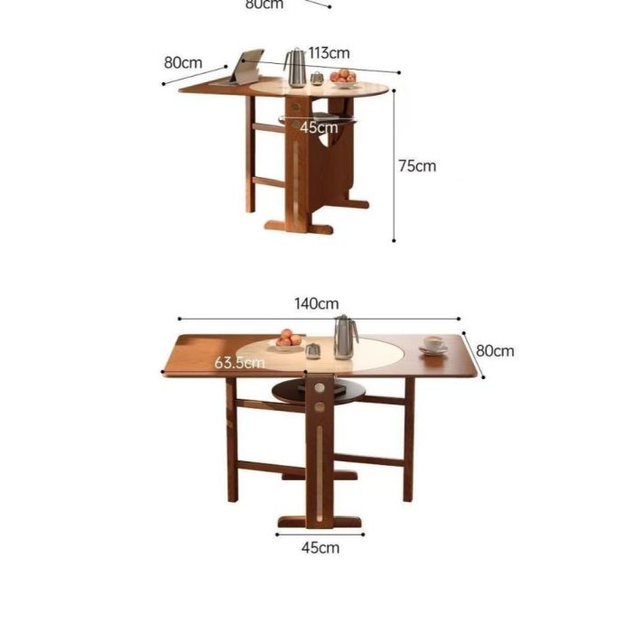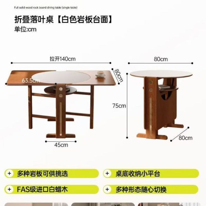 طاولة طعام من الخشب الصلب قابلة للطي بسطح صخري مصنوعة من خشب متين عالي الجودة، تصميم قابل للتحويل بين الشكل الدائري والنصف دائري، منصة تخزين سفلية عملية، مثالية للشقق الصغيرة وتوفر مساحة بأسلوب أنيق