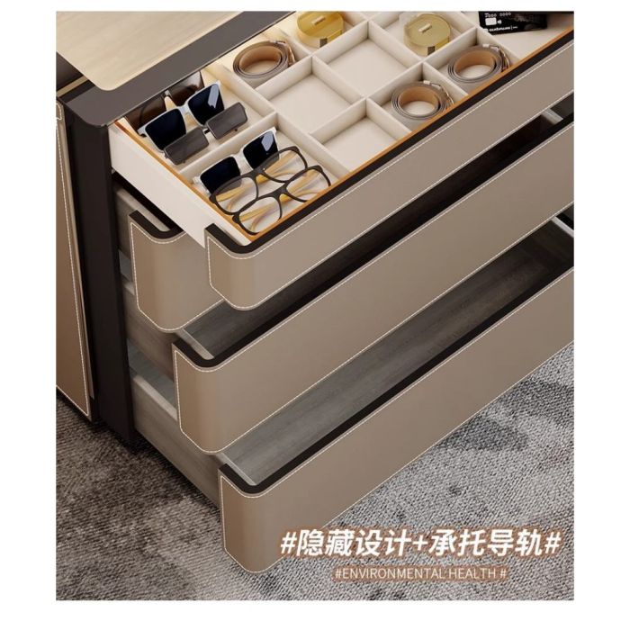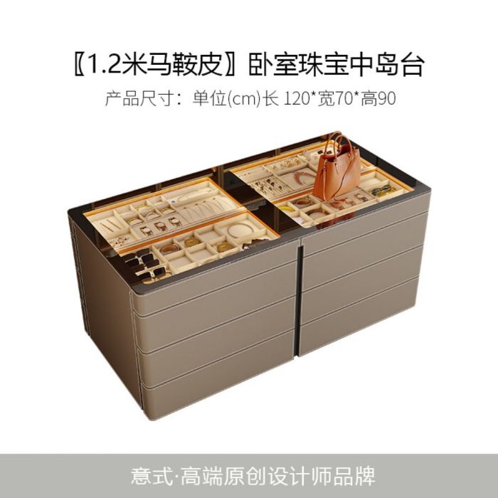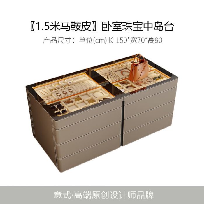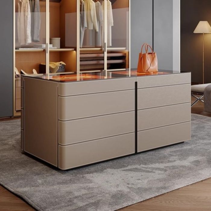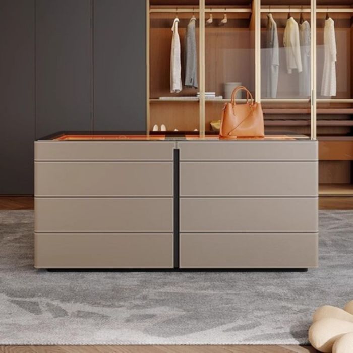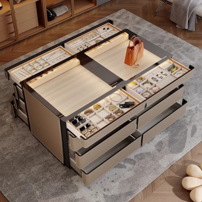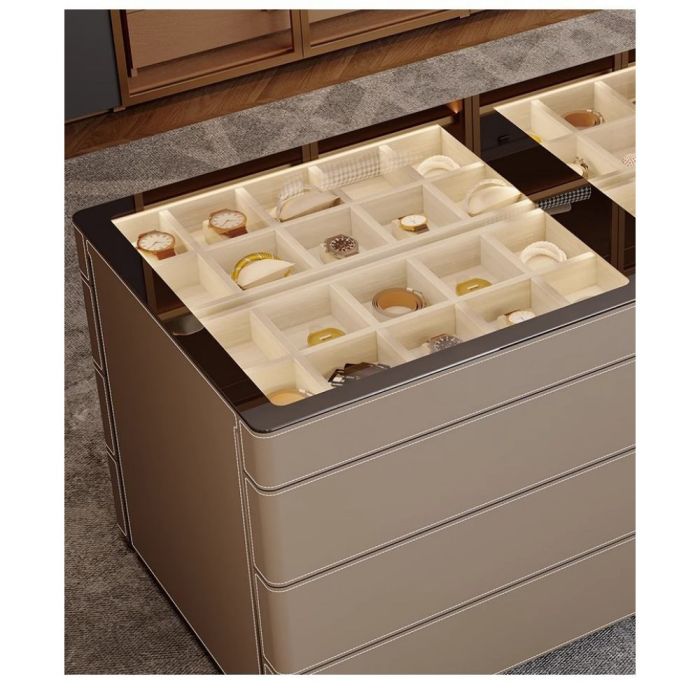 وحدة تنظيم مجوهرات بأدراج من خشب صلب وسطح زجاجي، توفر عرضاً أنيقاً مع تقسيمات داخلية منظمة، أدراج واسعة لتخزين آمن، تصميم عصري يعزز ترتيب غرفة النوم ويمنح لمسة فاخرة للمساحة