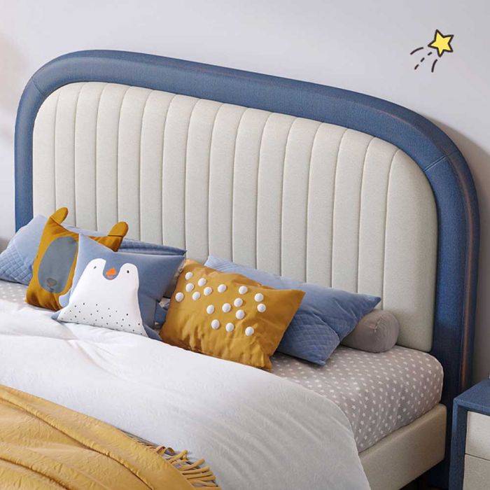 سرير أطفال من الخشب الصلب مع مساحة تخزين و طاولة جانبية مصنوع من هيكل متين مع ظهر مبطن بقماش ناعم سهل التنظيف، يوفر راحة عند الاستناد، وتنظيماً يومياً عملياً، ولمسة دافئة تمنح الطفل إحساساً بالأمان