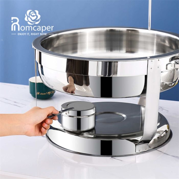 دلّل ضيوفك حيث تحكي كل نكهة قصة فريدة! صينية تقديم البوفيه هذه هي المساعد المثالي لتقديم الطعام، حيث تحافظ على درجة حرارة تقديم الطعام المثالية لساعات. تحتوي على وعاء ماء دائري، وعاء طعام دائري، إطار من الستانلس ستيل، وغطاء، وقاعدة للوقود. يتميز بمقبضين على الجانبين يسهّلان تحريك الوعاء، توزيع متساوي للحرارة وأوعية متداخلة لسهولة الاستخدام والتخزين