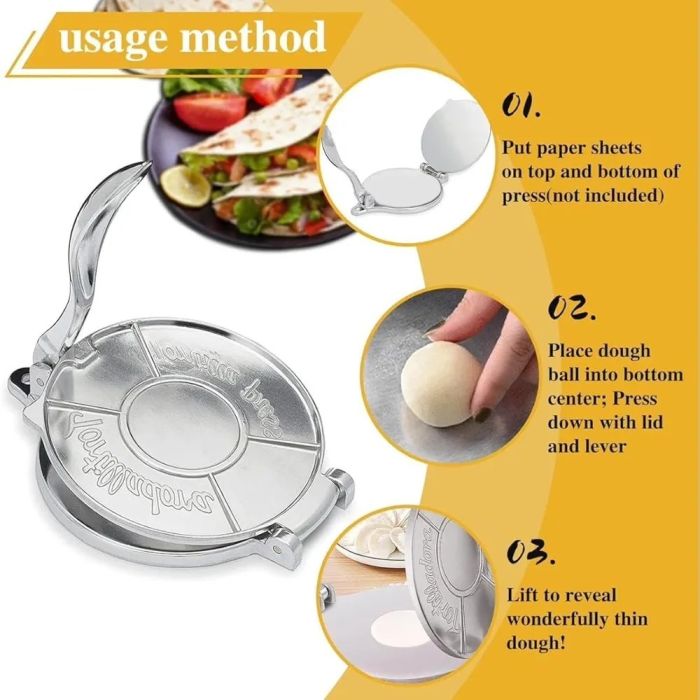 - مثالية لضغط أنواع مختلفة من العجين المسطح، مثل التورتيلا، وخبز الشاباتي الهندي، والفطائر الرقيقة، لنتائج موحدة الشكل والسماكة.